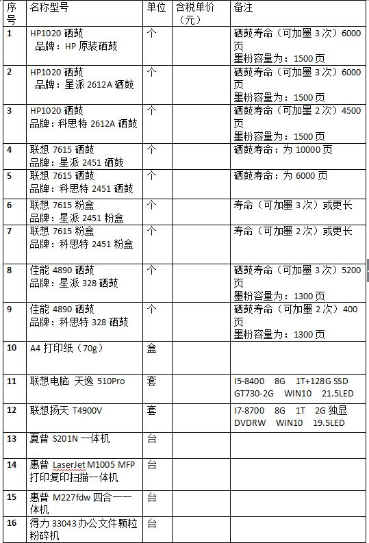 1、采購內(nèi)容包括計算機,打印機等通用辦公設備以及打印紙,硒鼓,墨盒等耗材;